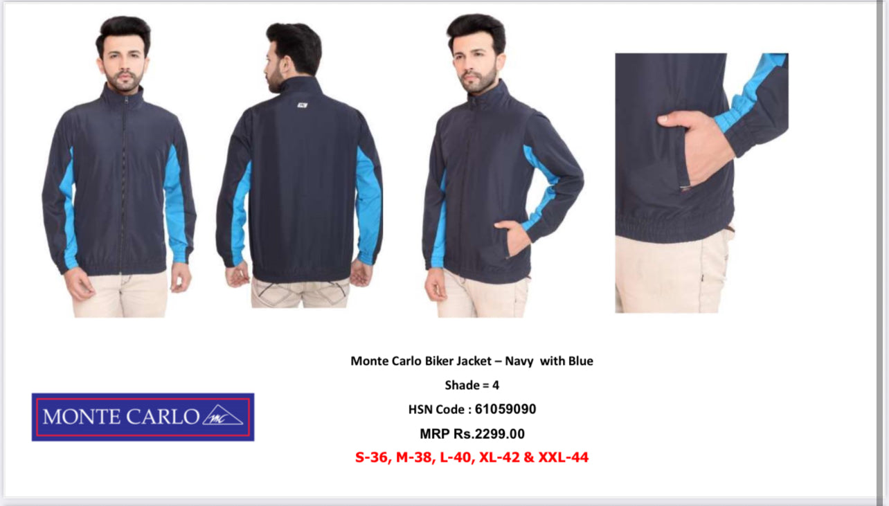 In summary, the image effectively showcases the Monte Carlo Biker Jacket through multiple views and provides essential product details, including pricing and sizing information.