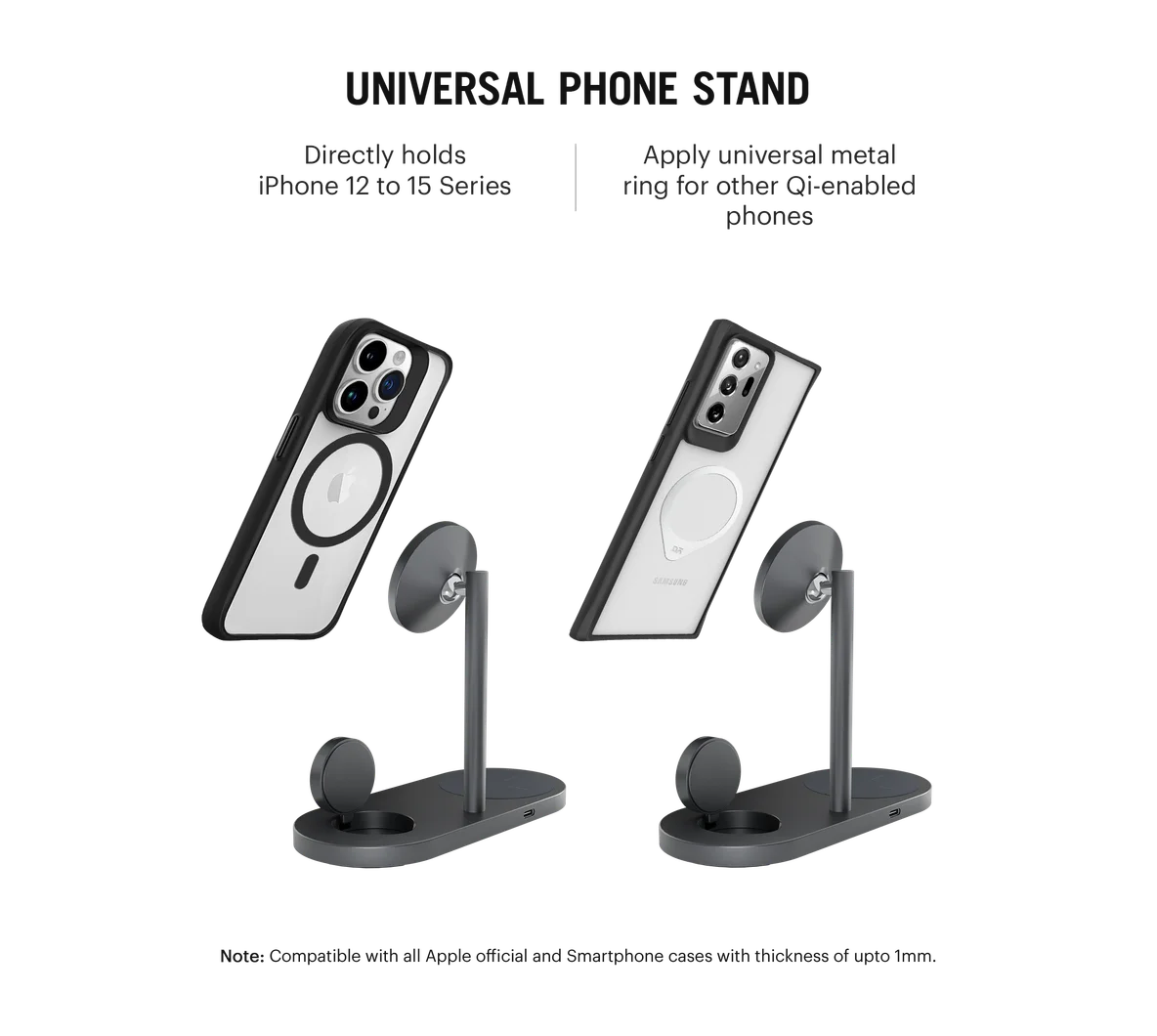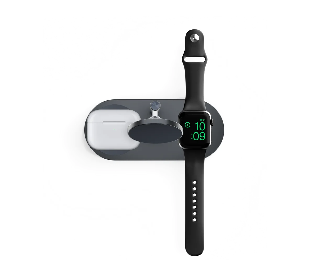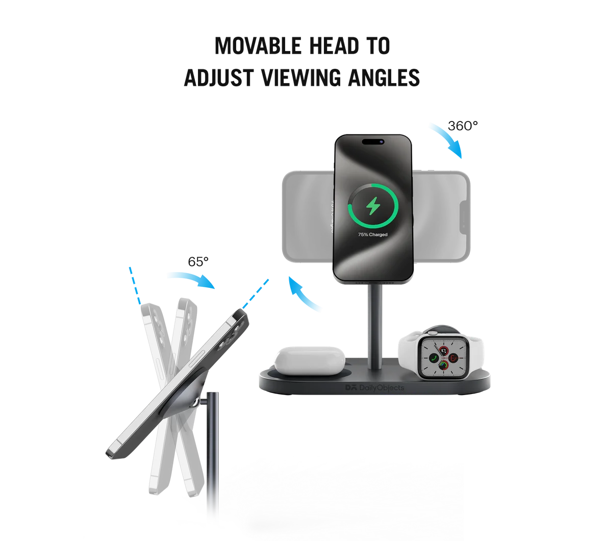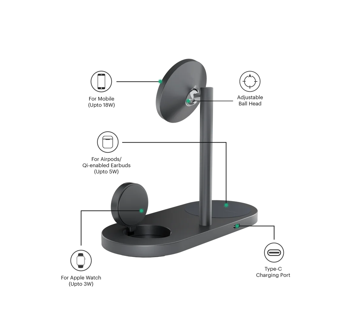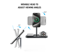 - Non-slip, silicone base pad for AirPods and Apple Watch, and movable ball head for phones