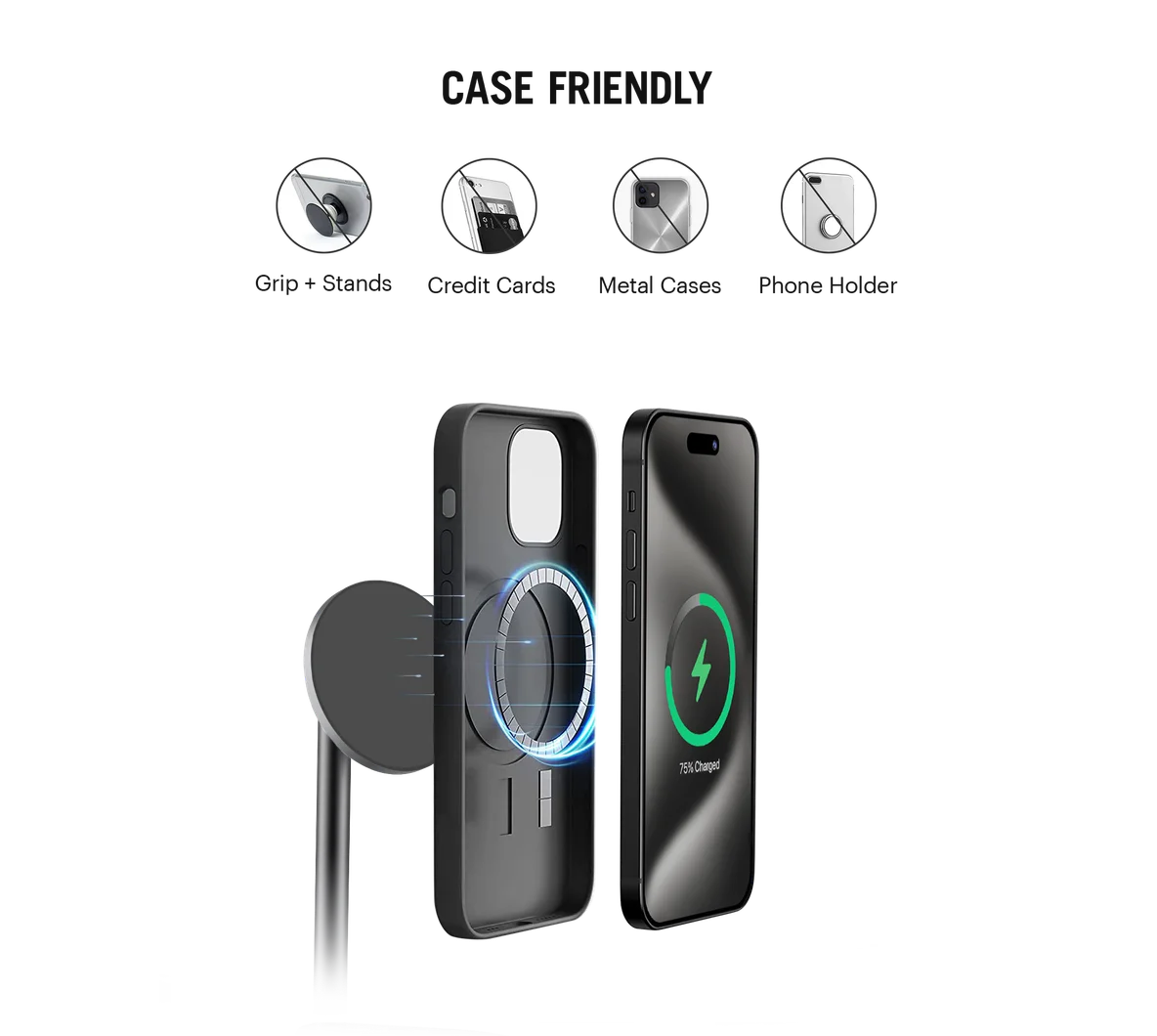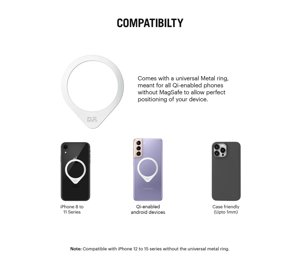 - Universal metal ring included to wirelessly charge Non-MagSafe, Qi-enabled phones