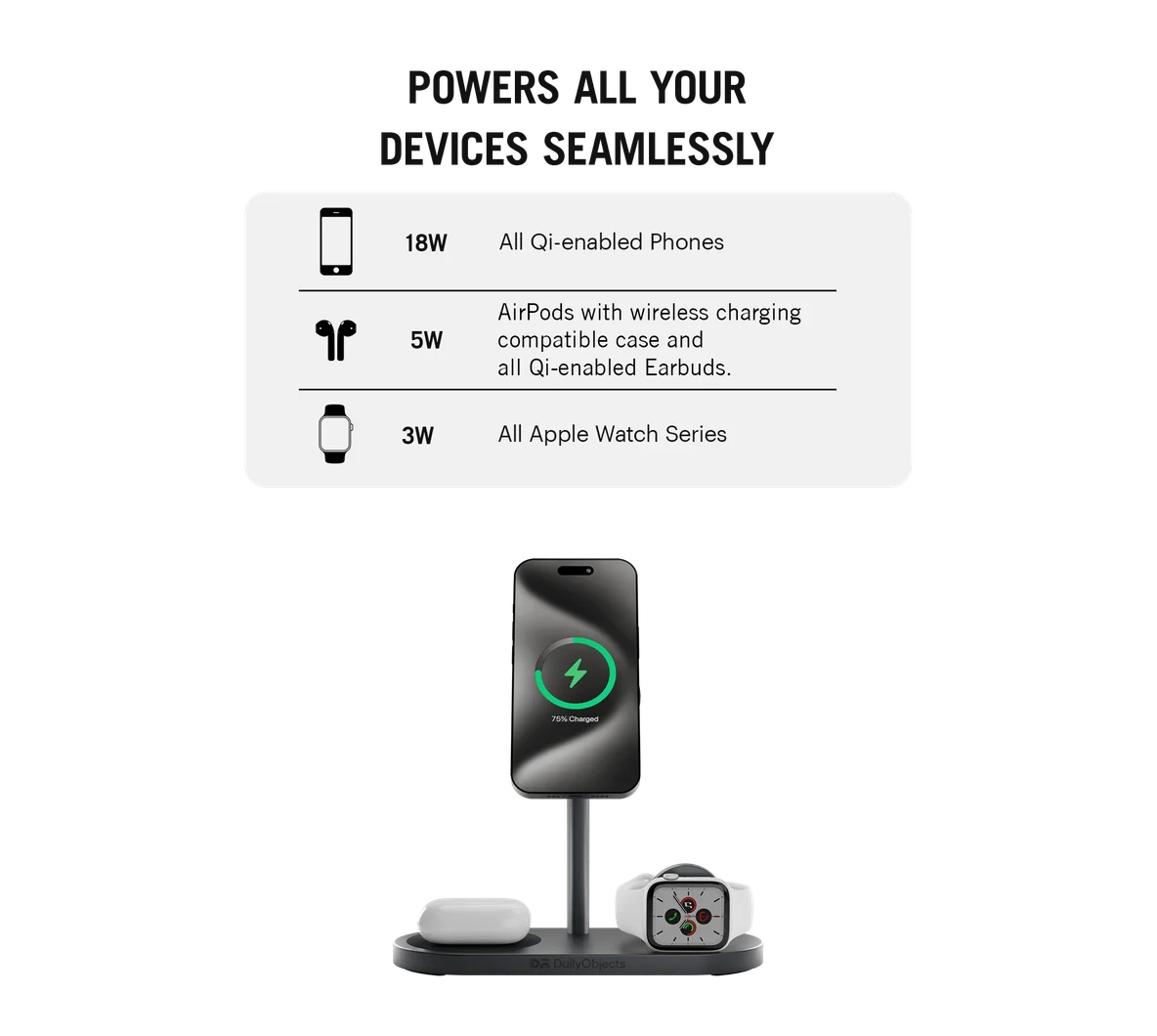 - Charges MagSafe-enabled iPhones and other Qi-enabled phones with maximum output of up to 30W, AirPods/Earbuds up to 5W and Apple Watch up to 3W