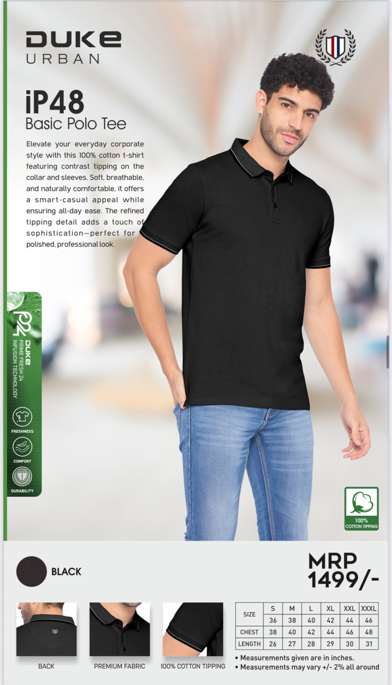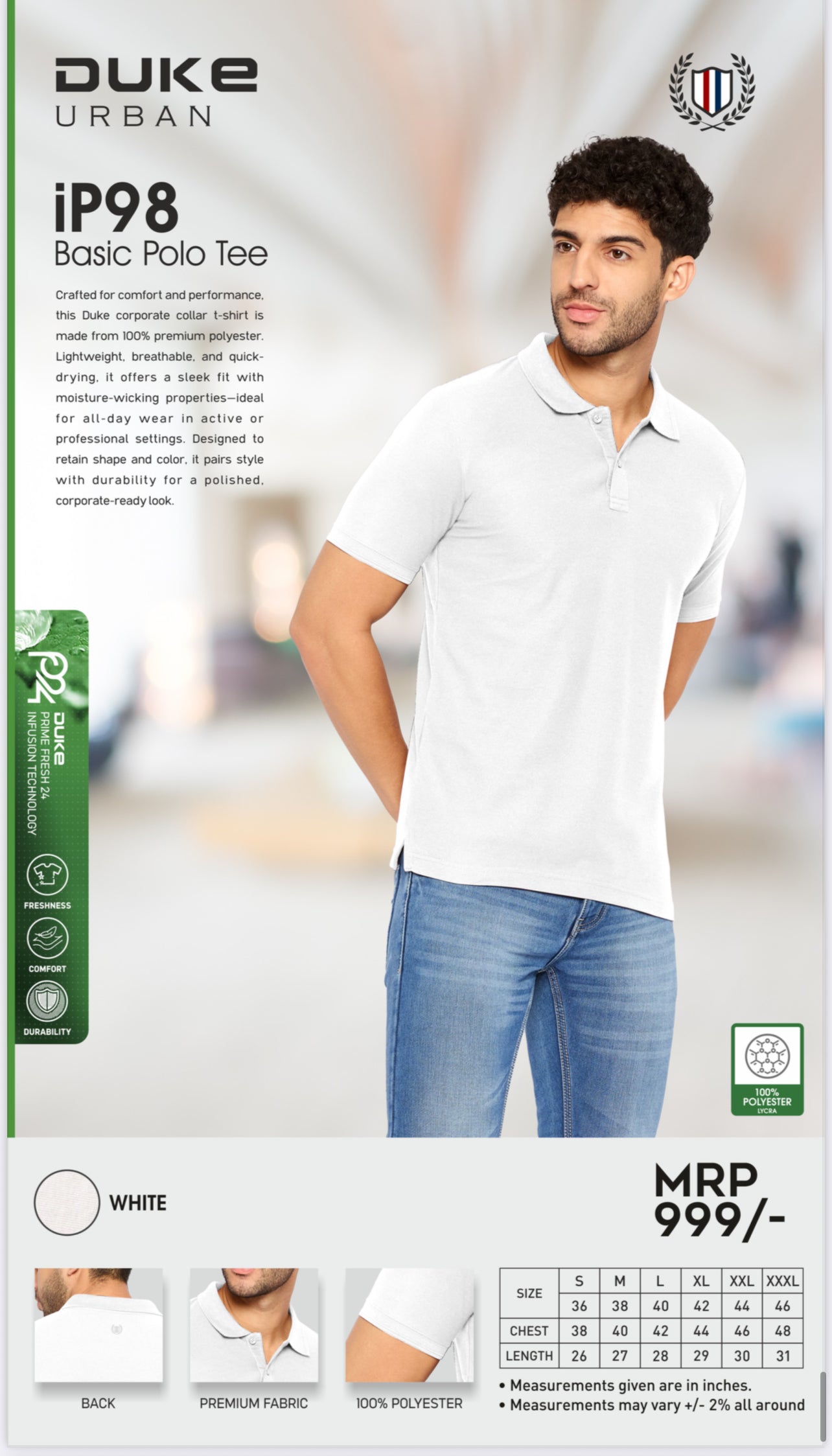 Overall, the image effectively showcases the features and benefits of the Duke Urban iP98 Basic Polo Tee, highlighting its comfort, performance, and style.