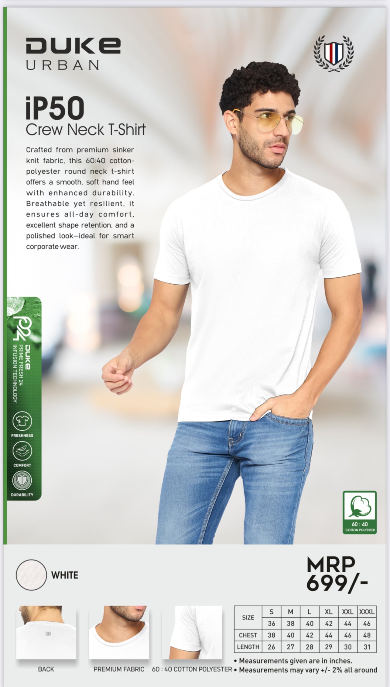 - A green logo in the bottom-right corner indicates that the product is made from 60:40 cotton-polyester.