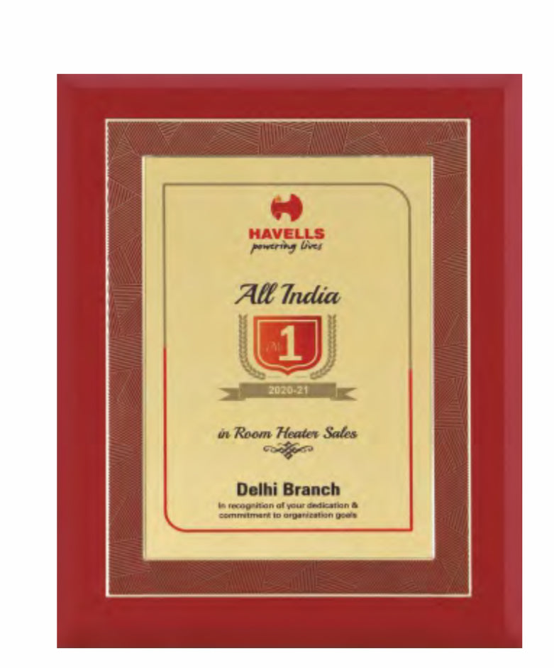 In summary, the certificate is a recognition of the Delhi branch's outstanding performance in room heater sales during the 2020-21 period, highlighting their achievement as the top performer in India.