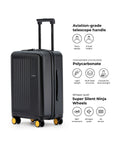 8 smooth Japanese Hinomoto wheels that glide across carpets and squeaky floors. The yellow detail makes it stand out at baggage claim.